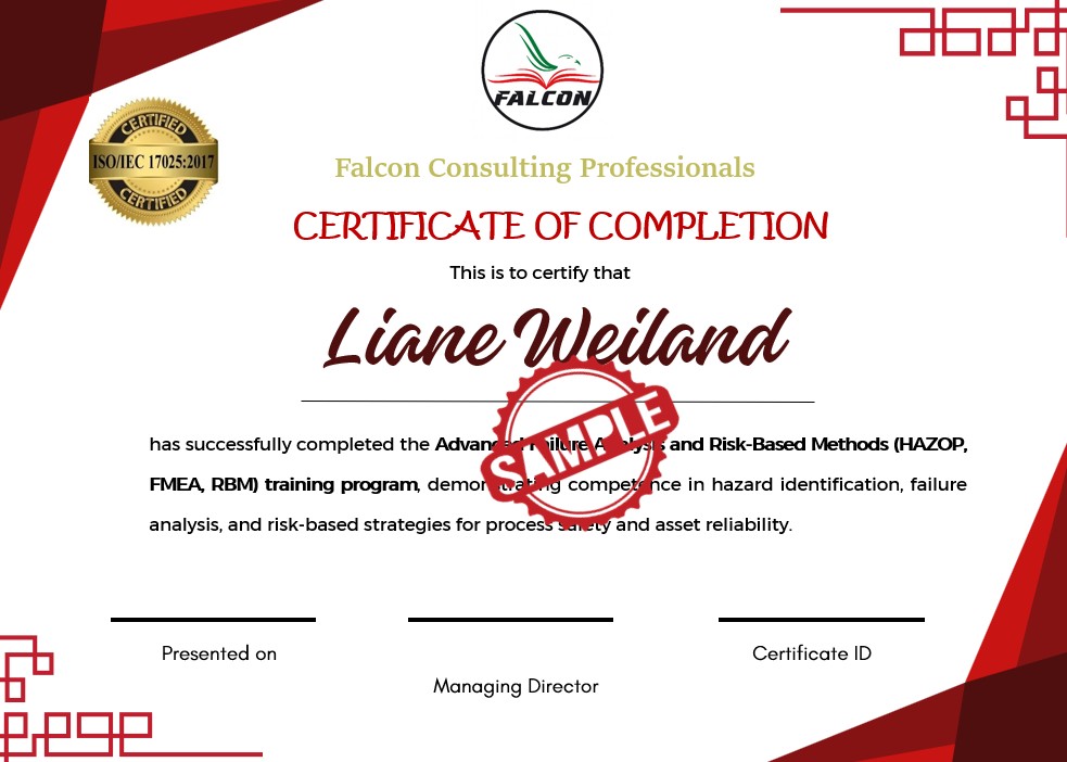 On successful completion of the course and course requisites, the candidate will receive the Certification in Advanced Failure Analysis & Risk-Based Methods (HAZOP, FMEA, RBM).